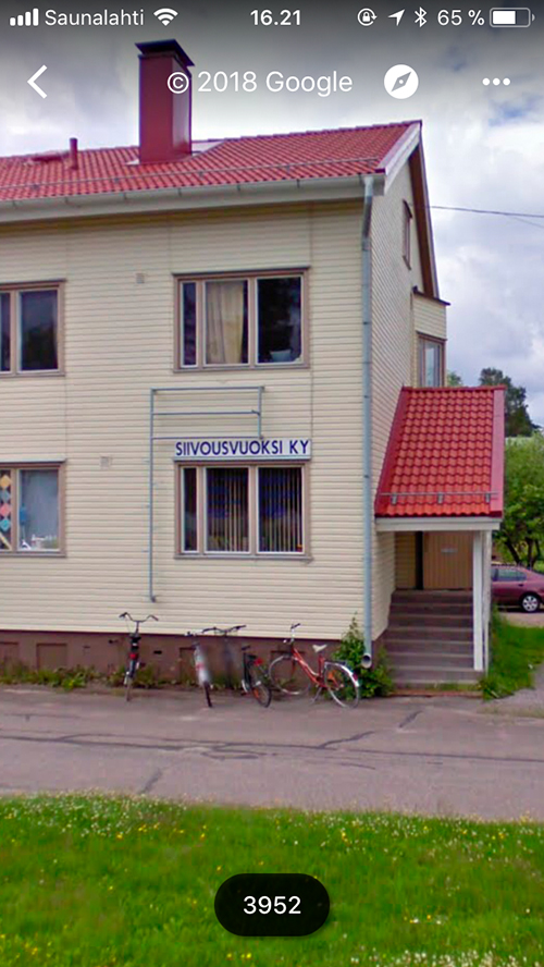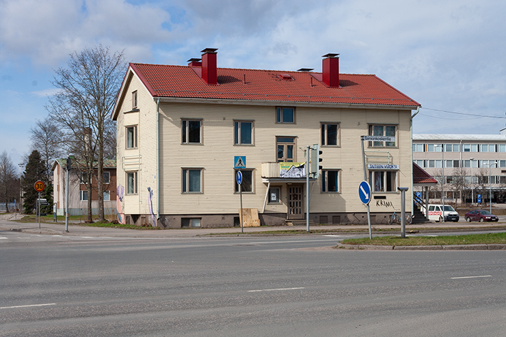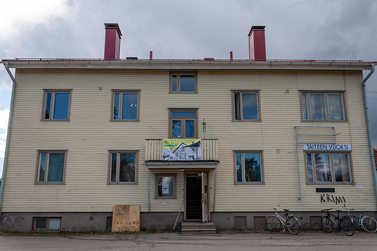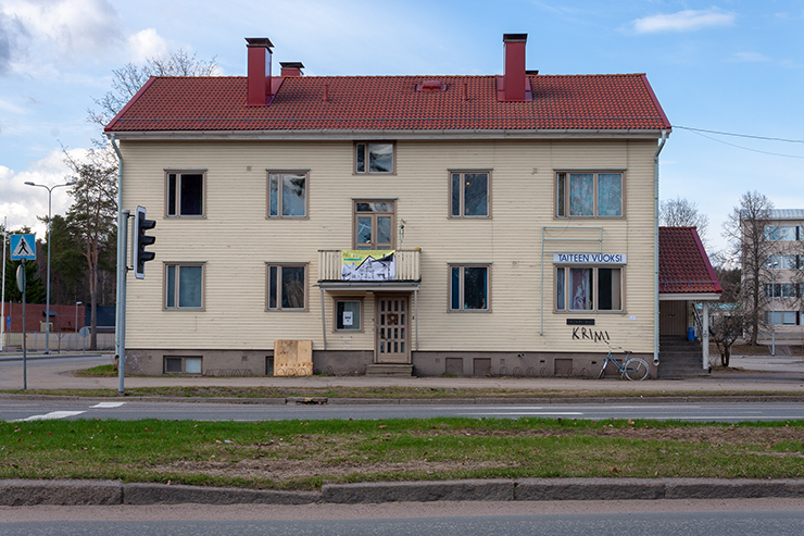 Talon seinään oli kiinnitettynä kyltti, johon oli painettu sanat TAITEEN VUOKSI. Aikaisemmin samaisella paikalla olleessa kyltissä luki SIIVOUSVUOKSI KY. ”Vuoksi” on Imatralla toimivien yrittäjien suosima nimeämiskäytänne ja kulttuurisesti merkittävä, Vuoksen alueen asukkaita yhdistävä käsite. TAITEEN VUOKSI -kyltti oli teos Koti nimeltä Krimi -purkutalonäyttelyssä, joka pidettiin "Krimi" -nimellä tunnetuissa kahdessa asuinrakennuksessa Imatralla kesällä 2018. Krimin talot purettiin myöhemmin saman vuoden aikana.